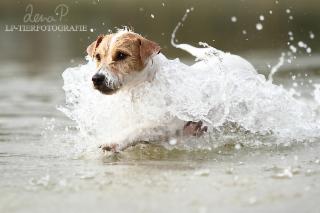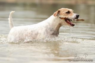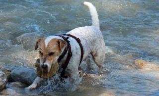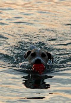 Beim Baden ist seine Lieblingsbeschäftigung nach Steinen zu tauchen und diese dann am Ufer abzulegen.